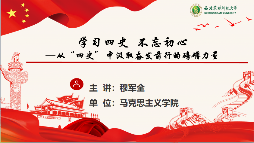 穆军全以“四史”学习的政治意义和理论价值为切入点,梳理“四史”的基本脉络,强调学习“四史”需要把握的三个维度,即把握好价值维度,正本溯源,辨明真伪;把握好理论维度,掌握学习“四史”的准确方法;把握好核心维度,树立学习“四史”的整体大局观。他希望同学们做信念的坚定者,梦想的奋斗者,时代的搏击者;胸怀忧国忧民之心,爱国爱民之情,扎根杨凌,胸怀社稷,为我国农业发展做出自己的贡献。