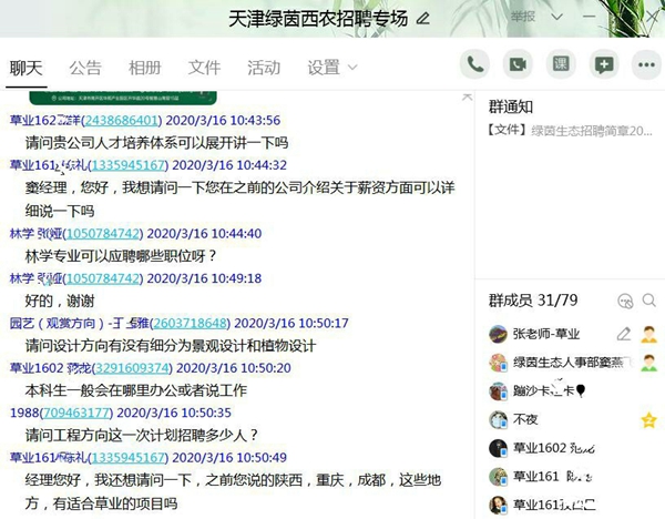 3月16日,我院邀约天津绿茵景观生态建设股份有限公司通过“云课堂”成功举办网络云招聘宣讲会,来自草业、园林、林学、经管、植保、水建、机电、人文等学院相关专业的近80名学生参加。